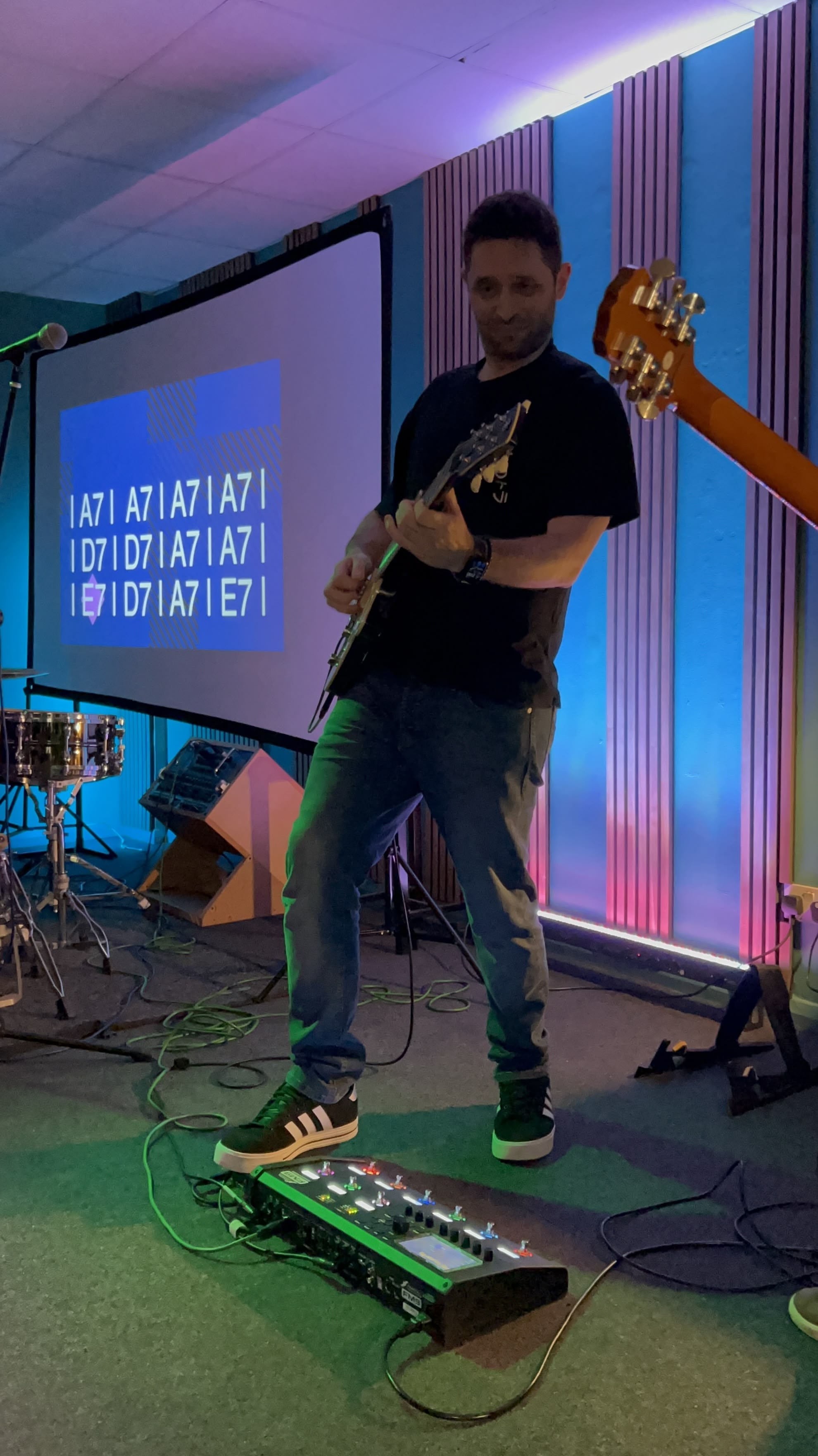 You weren’t up there by yourself though. You had Sam giving tips and feedback, and 2 other guitarists in the same boat as you. Then came the fast blues track that got you to rotate soloists every few bars.